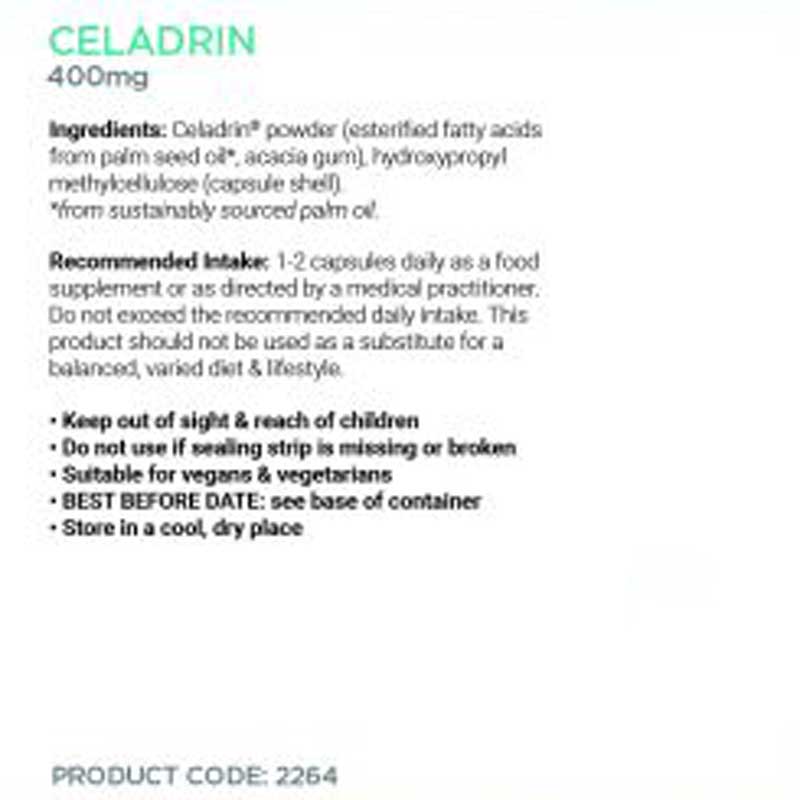 Ingredients: Celadrin® powder (esterified fatty acids from palm seed oil*, acacia gum), C. hydroxpropyl methylcellulose (capsule shell) *from sustainably sourced palm oil.
