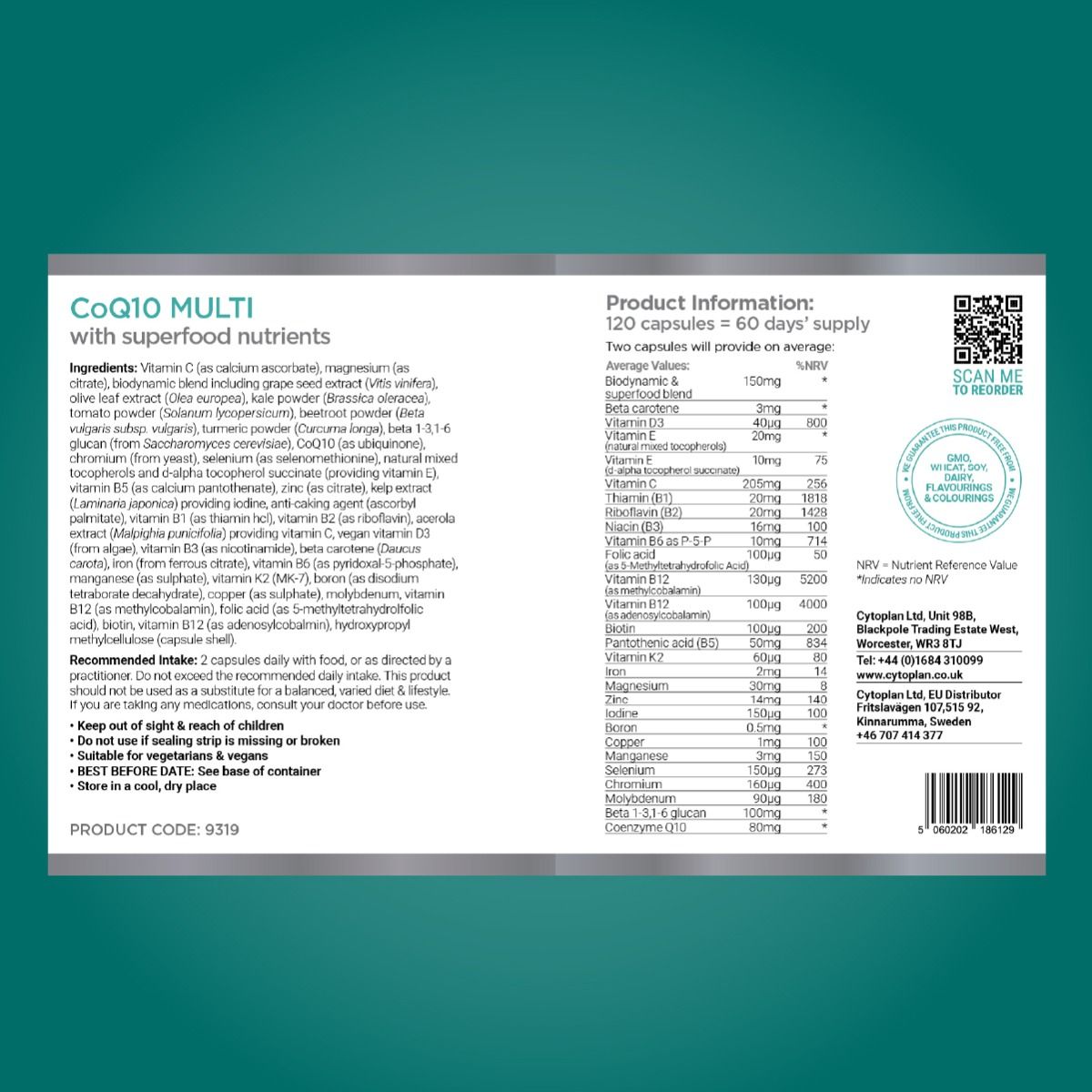 Cytoplan’s most advanced high strength multivitamin and mineral enhanced with a phytonutrient-rich superfood blend and Coenzyme Q10. Optimal daily nutrient support for energy, brain health and immunity.