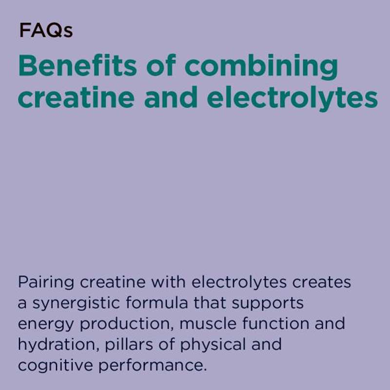 A high-potency complex combining creatine and electrolytes to support everyday energy production, hydration and recovery – key pillars of physical and mental performance. A unique synergistic blend of creatine and electrolytes to support both energy and hydration to help everyone perform better, whatever their demands.