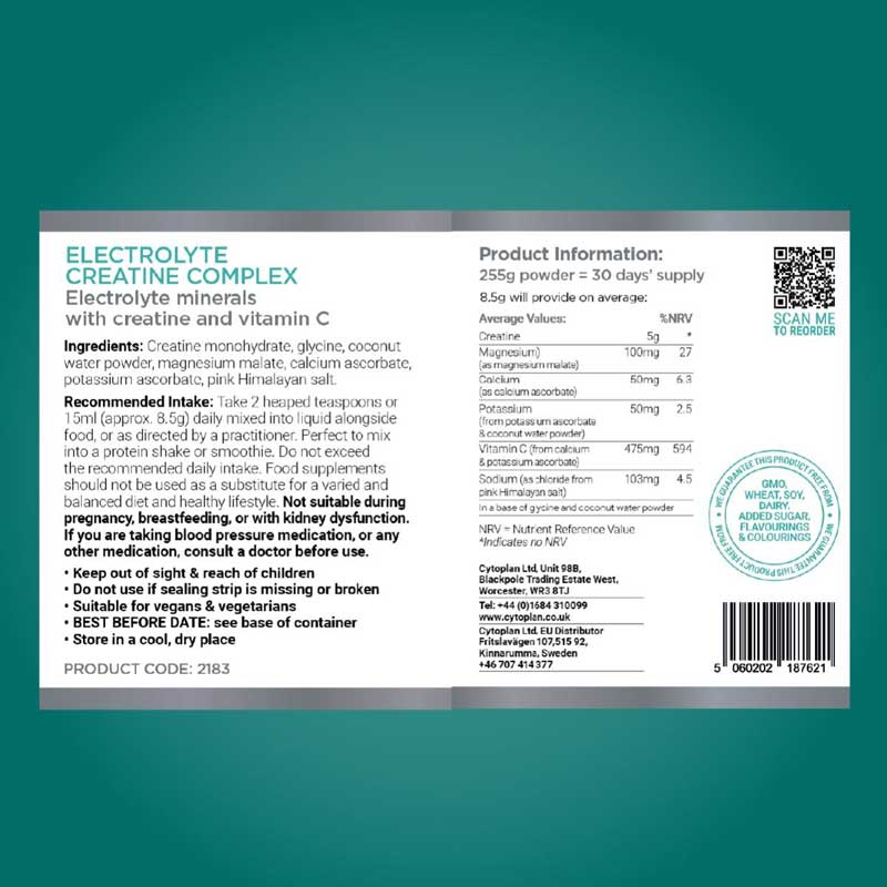 Cytoplan Electrolyte Creatine Complex is a high potency, flexible, neutral tasting powder complex with mineral electrolytes and creatine for everyday energy, hydration and recovery. A perfect combination to support energy during exercise, or for reduction of everyday fatigue. It includes magnesium malate, the best form to support energy production, calcium and potassium as bio-effective ‘ascorbate’ forms, in a base of coconut water powder, providing natural levels of potassium.