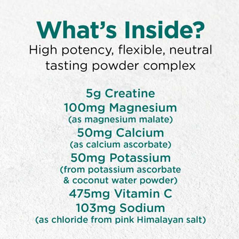 Ingredients: Creatine monohydrate, glycine, coconut water powder, magnesium malate, calcium ascorbate, potassium ascorbate, pink Himalayan salt.