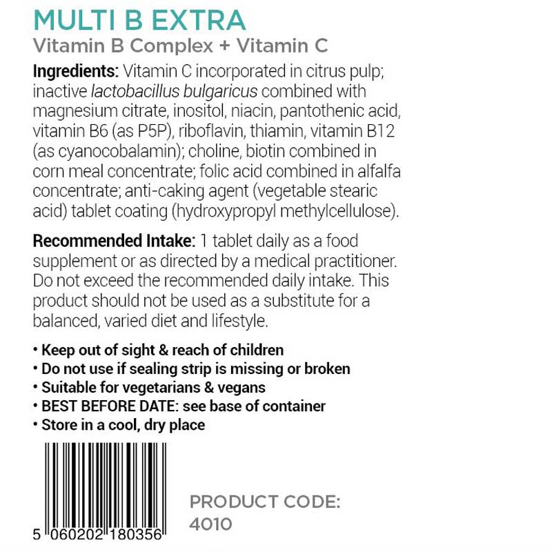 Multi B Extra also includes vitamin C for antioxidant support, to help protect the body’s cells against oxidative stress, and magnesium, which supports energy and nervous function, as a perfect complement to the B vitamins.