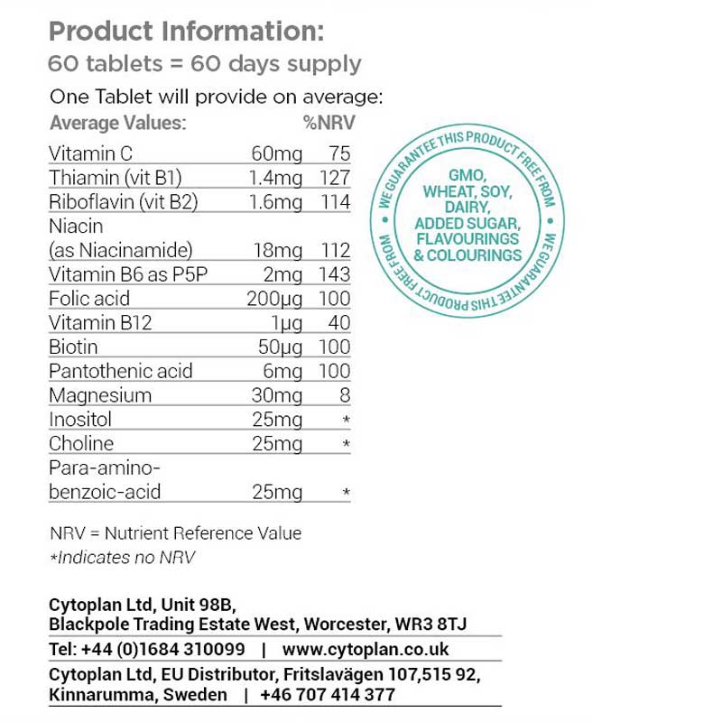 Comprehensive vitamin B complex in a gentle and Bio-Effective® food form providing all the essential B vitamins at around 100% of the Nutrient Reference Value (NRV), the minimum levels recommended to be taken each day. It includes all the vital B vitamins, including thiamine, niacin and pantothenic acid, folate and vitamin B12.