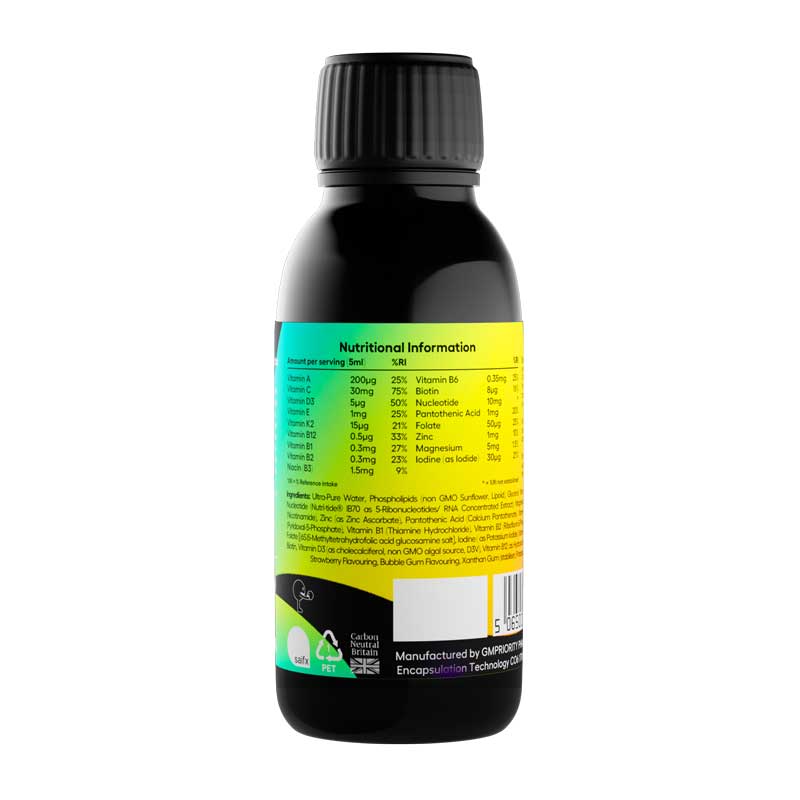 Ingredients: Ultra-Pure Water, Phospholipids (non GMO Sunflower, Lipoid), Glycerol, Vitamin C (as Ascorbic Acid, Quali®-C), Nucleotide (Nutri-tide® IB70 as 5-Ribonucleotides/ RNA Concentrated Extract), Magnesium (as Magnesium Citrate), Niacin (Nicotinamide), Zinc (as Zinc Ascorbate), Pantothenic Acid (Calcium Pantothenate), Vitamin E (Mixed Tocopherol), Vitamin B6 (Pyridoxal-5-Phosphate), Vitamin B1 (Thiamine Hydrochloride), Vitamin B2 (Riboflavin-5-Phosphate), Vitamin A (Retinyl Acetate), Folate [(6S)5-Methyltetrahydrofolic acid glucosamine salt], Iodine ( as Potassium Iodide), Vitamin K2 (as Menaquinone-7, VitaMK7®), Biotin, Vitamin D3 (as cholecalciferol, non GMO algal source, D3V), Vitamin B12 (as Hydroxocobalamin), Xylitol (sweetener), Natural Strawberry Flavouring, Bubble Gum Flavouring, Xanthan Gum (stabiliser), Potassium sorbate (preservative).