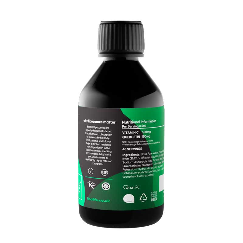 Ingredients: Ultra-Pure Water, Phospholipids (non GMO Sunflower, Lipoid®), Vitamin C (as Sodium Ascorbate and Ascorbic Acid, Quali®-C), Quercetin (as Quercetin Dihydrate), Glycerol, Potassium Hydroxide (acidity regulator), Ethanol, Potassium Sorbate (preservative), Mixed Tocopherols (antioxidant).
