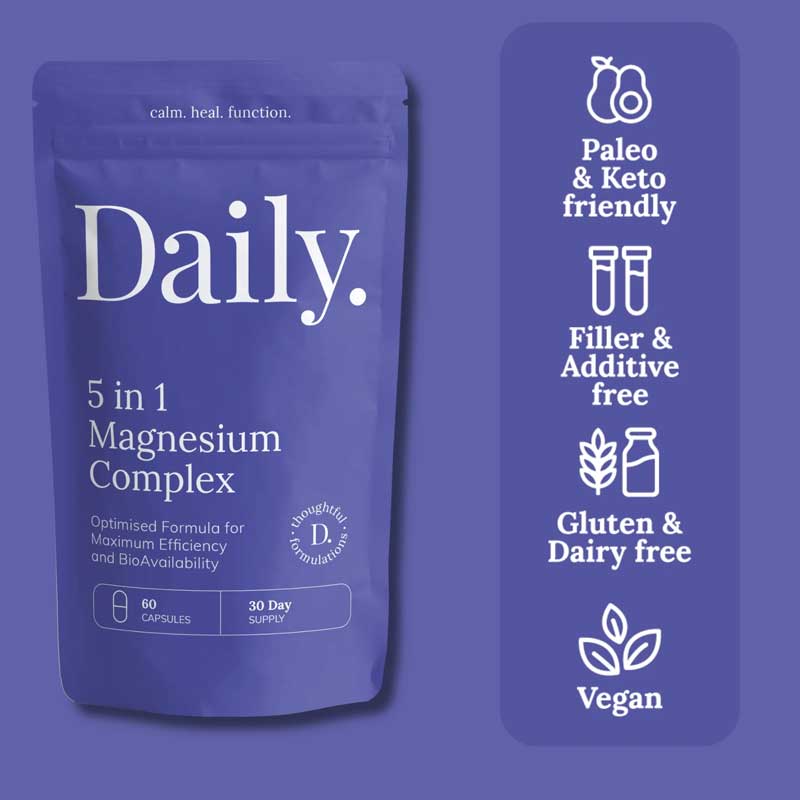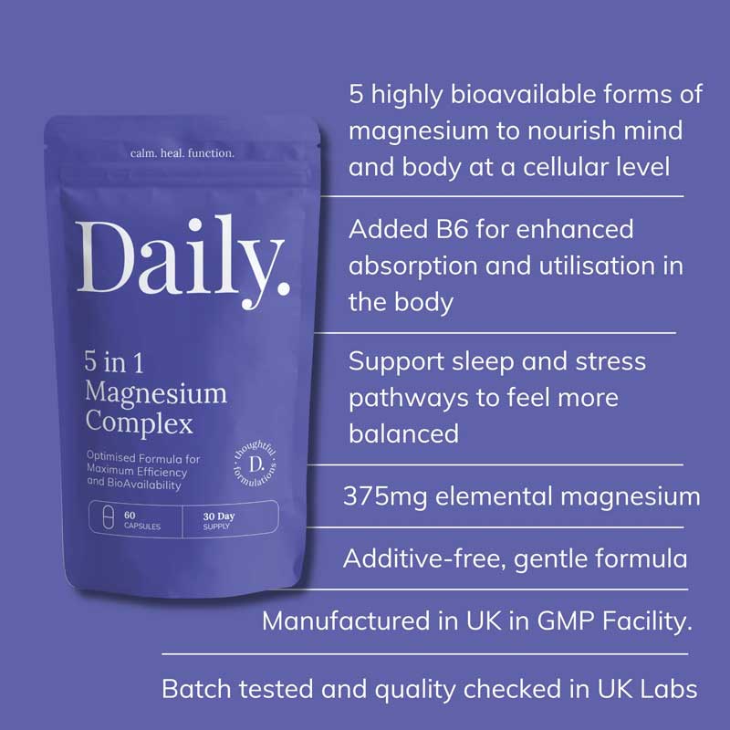 Modern life depletes magnesium; Daily Magnesium helps restore it in the most comprehensive way possible. With its 5-in-1 blend and active B6, it’s designed to calm your nervous system, heal at a cellular level, and help your body function at its best – every single day.