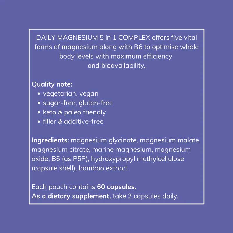 Daily Magnesium delivers a complete spectrum of five bioavailable forms of magnesium, combined with active (methylated) vitamin B6, to help restore your levels where your body needs it most.