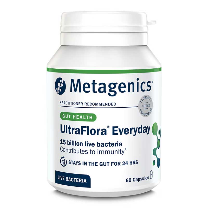 The UltraFlora® range is a live bacteria range at heart of the Metagenics® brand, featuring science backed strains that have been clinically tested to stay in the gut for 24hrs. “Ultra” denotes the power of the brand with strong doses to match clinical research, and “Flora” denotes friendly bacteria which are known as gut flora and together make up your gut microbiome.