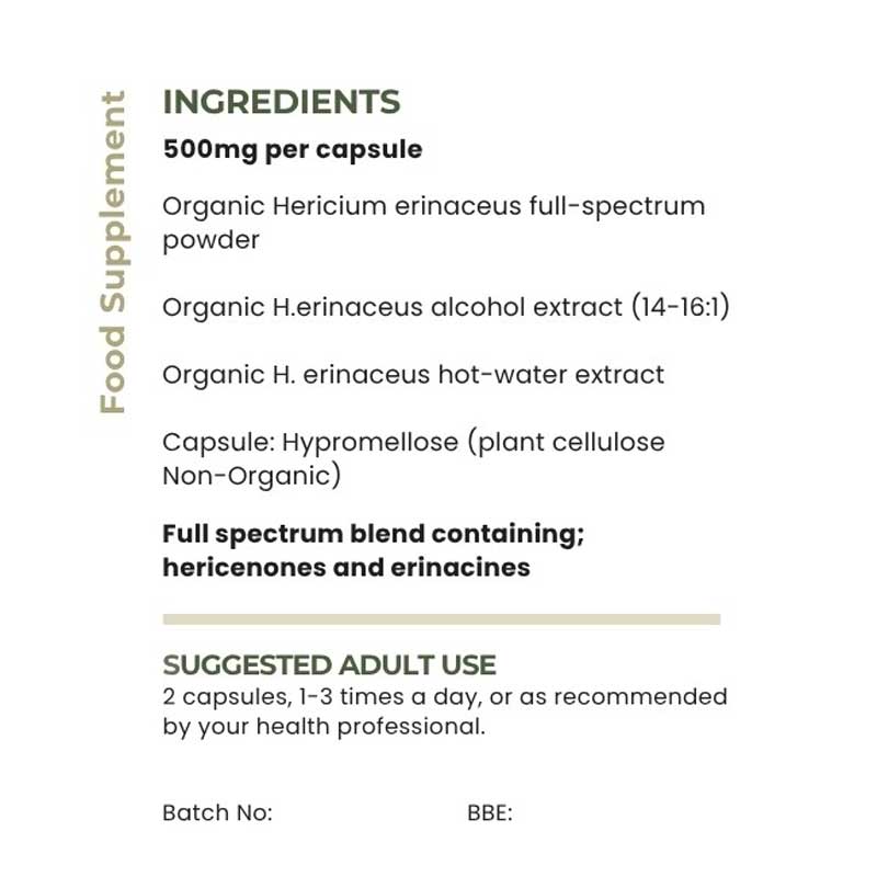 Lion’s Mane is a distinctive edible mushroom that grows on aged hardwood trees. Due to its protected status in parts of Europe, including the UK, MycoNutri™ Lion’s Mane is produced exclusively from cultivated H. erinaceus.