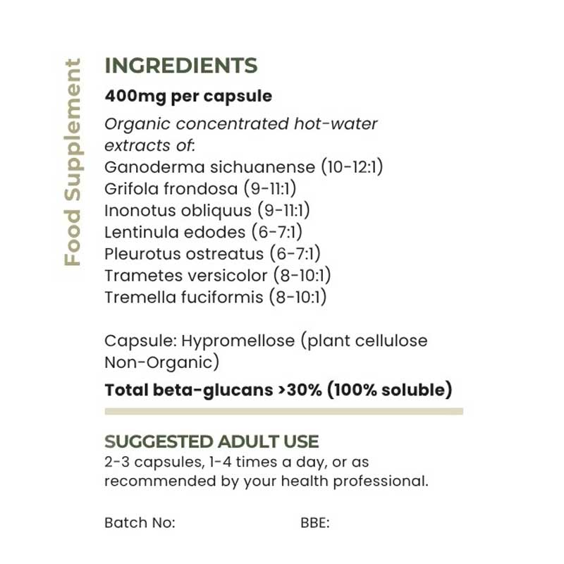MycoNutri™ PS-7 is a polysaccharide-focused formulation developed to help support balanced immune function. It contains organic hot-water extracts, standardised for polysaccharide content, from seven mushroom species: Chaga, Coriolus, Maitake, Oyster Mushroom, Reishi, Shiitake, and Snow Fungus.