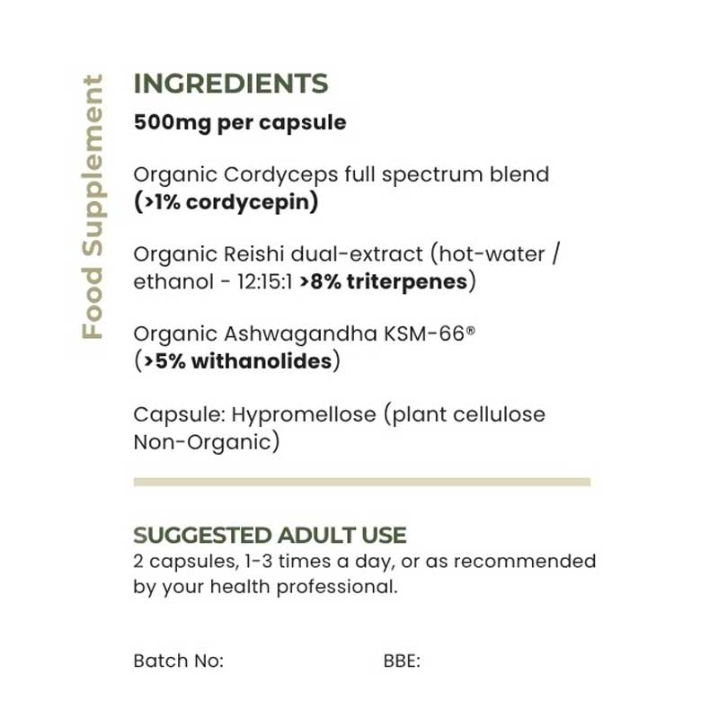 Cordyceps and Reishi are well-characterised for their adaptogenic properties, which may help support physiological balance during times of physical or mental stress. Ashwagandha contributes withanolides that have been studied for their role in supporting stress tolerance and hormonal function. Together, these components help support immune regulation and metabolic vitality.